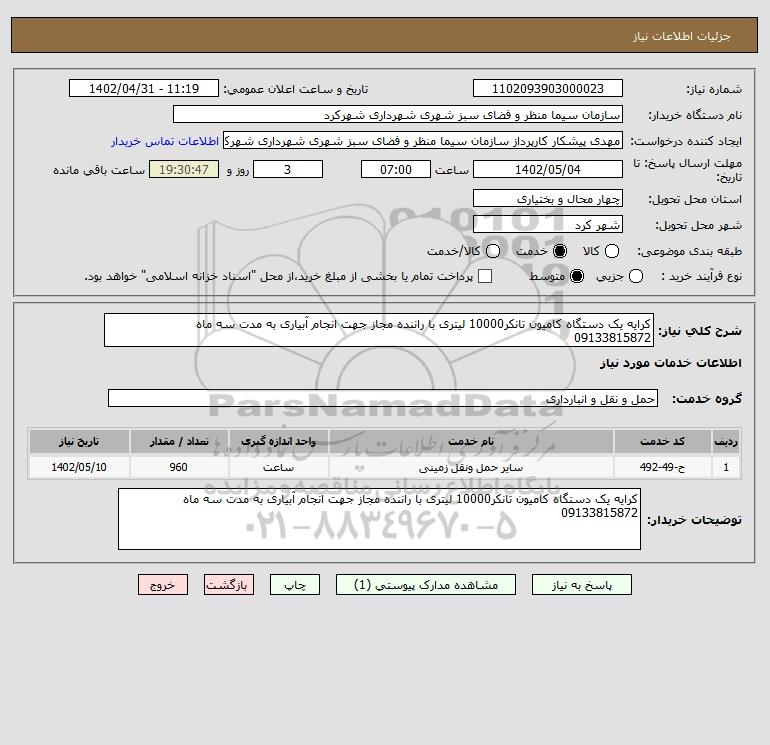 شرح کلی نیاز: کرایه یک دستگاه کامیون تانکر10000 لیتری با راننده مجاز جهت انجام آبیاری به مدت سه ماه