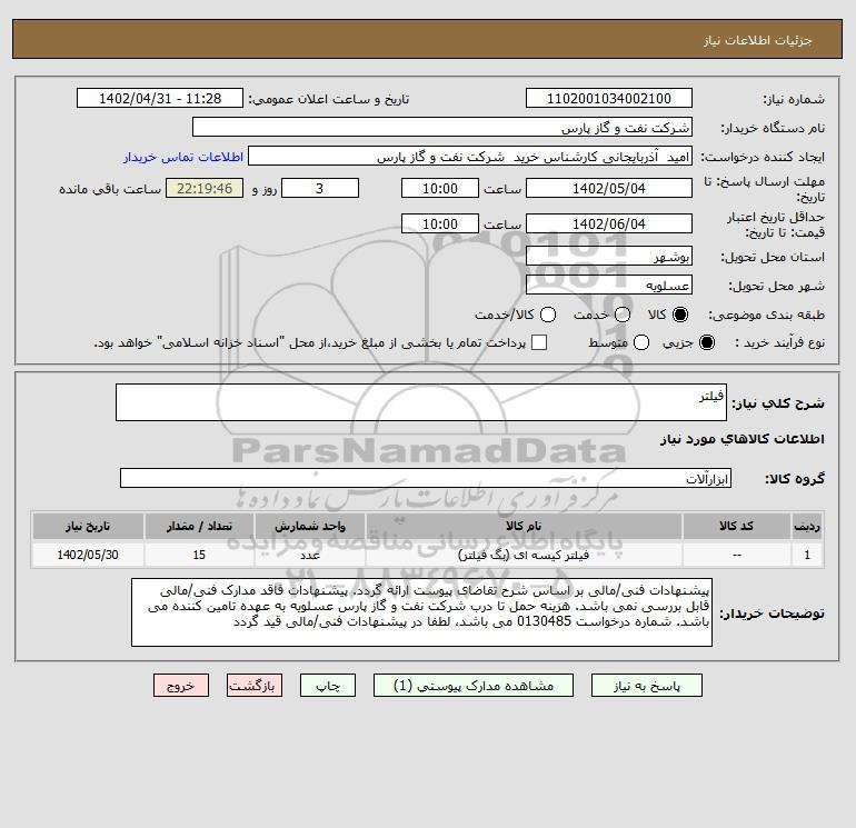 توضیحات خریدار:پیشنهادات فنی/مالی بر اساس شرح تقاضای پیوست ارائه گردد. پیشنهادات فاقد مدارک فنی/مالی قابل بررسی نمی باشد. هزینه حمل تا درب شرکت نفت و گاز پارس عسلویه به عهده تامین کننده می باشد. شماره درخواست 0130485 می باشد، لطفا در پیشنهادات فنی/مالی قید گردد