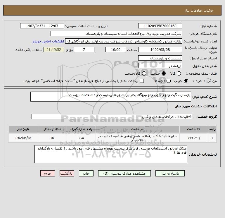 شرح کلی نیاز: بازسازی گیت والو و گلوب والو نیروگاه بخار ایرانشهر طبق لیست و مشخصات پیوست