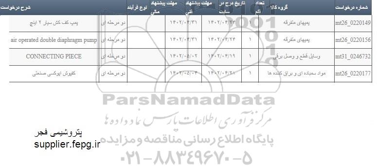 | شماره درخواست | گروه کالا | تعداد قلم | مهلت پیشنهاد فنی | نوع فرآیند | شرح درخواست |
