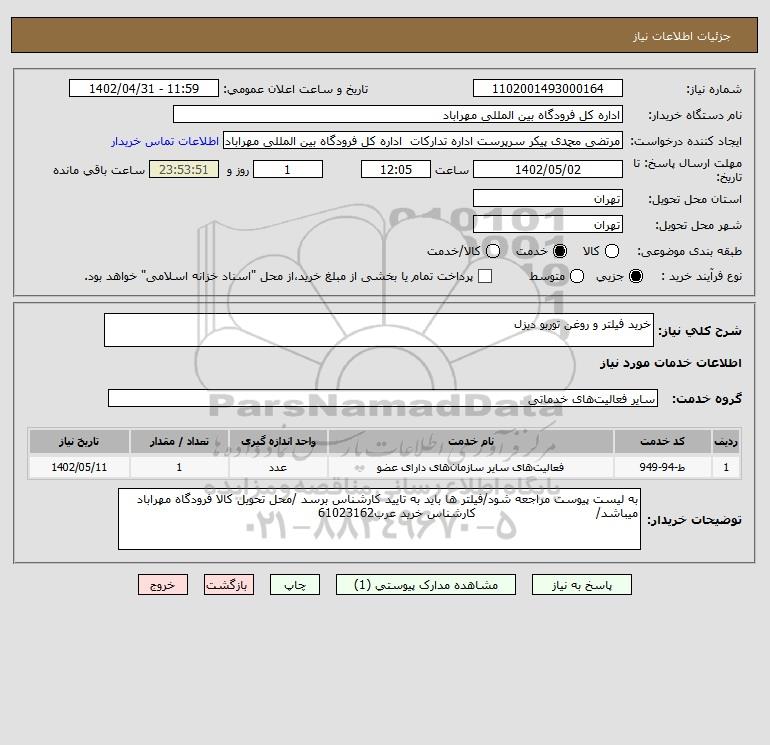 شرح کلی نیاز: خرید فیلتر و روغن توربو دیزل