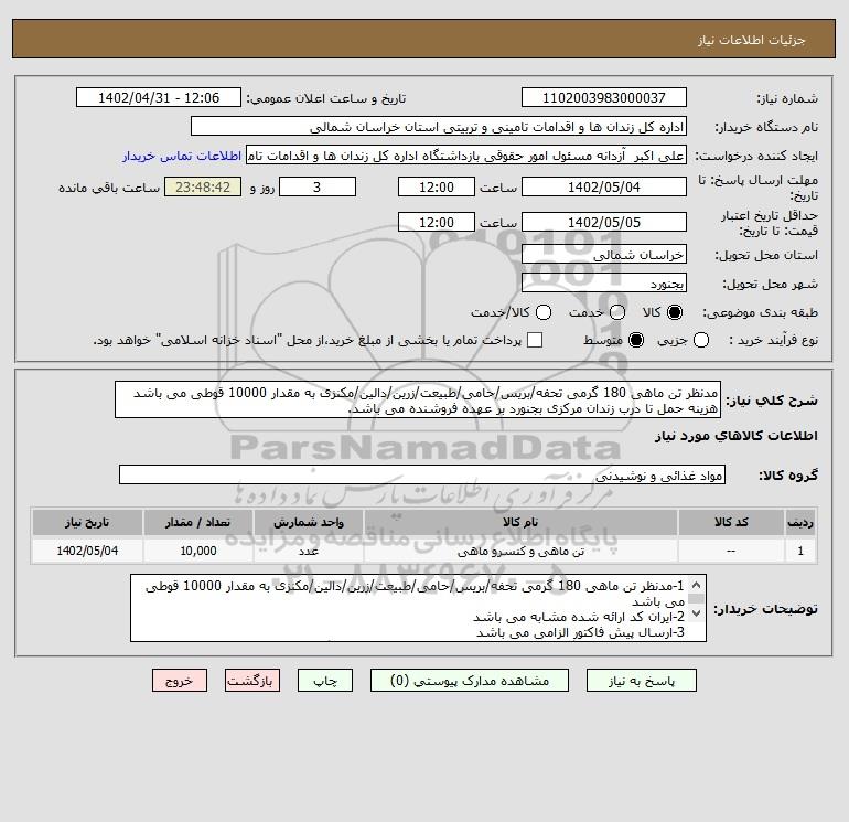 شرح کلی نیاز: مدنظر تن ماهی 180 گرمی تحفه/بریس/حامی/طبیعت/زرین/دالین/مکنزی به مقدار 10000 قوطی می باشد