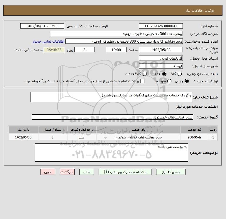 شرح کلی نیاز: واگزاری خدمات بیمارستان مطهری(ایران کد معادل می باشد)