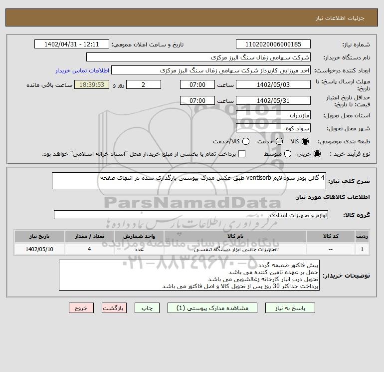 شرح کلی نیاز: 4 گالن پودر سودالایم ventisorb طبق عکس مدرک پیوستی بارگذاری شده در انتهای صفحه