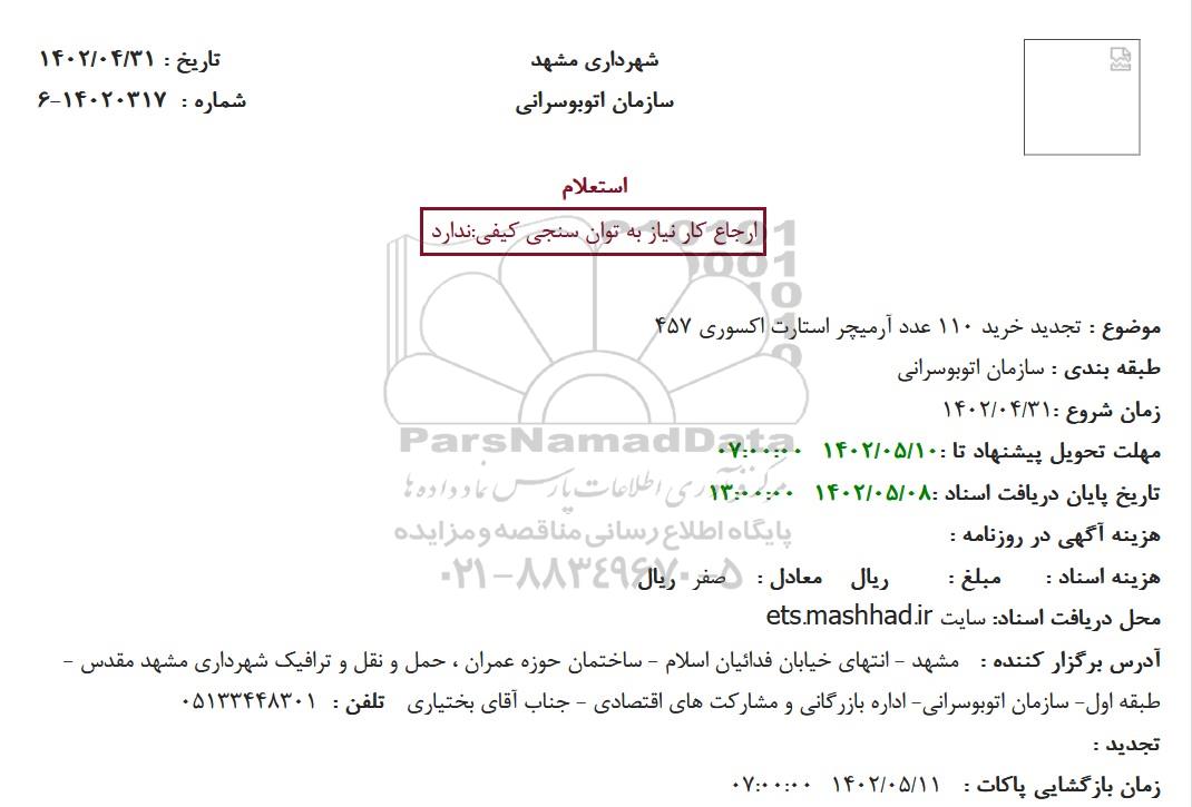 موضوع : تجدید خرید 110 عدد آرمیچر استارت اکسوری 457