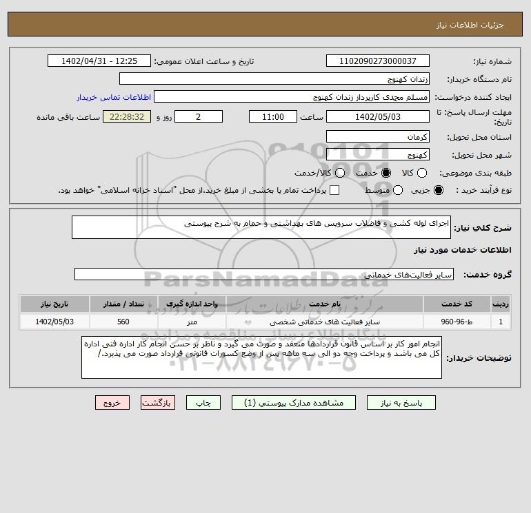 شرح کلی نیاز: اجرای لوله کشی و فاضلاب سرویس های بهداشتی و حمام به شرح پیوستی