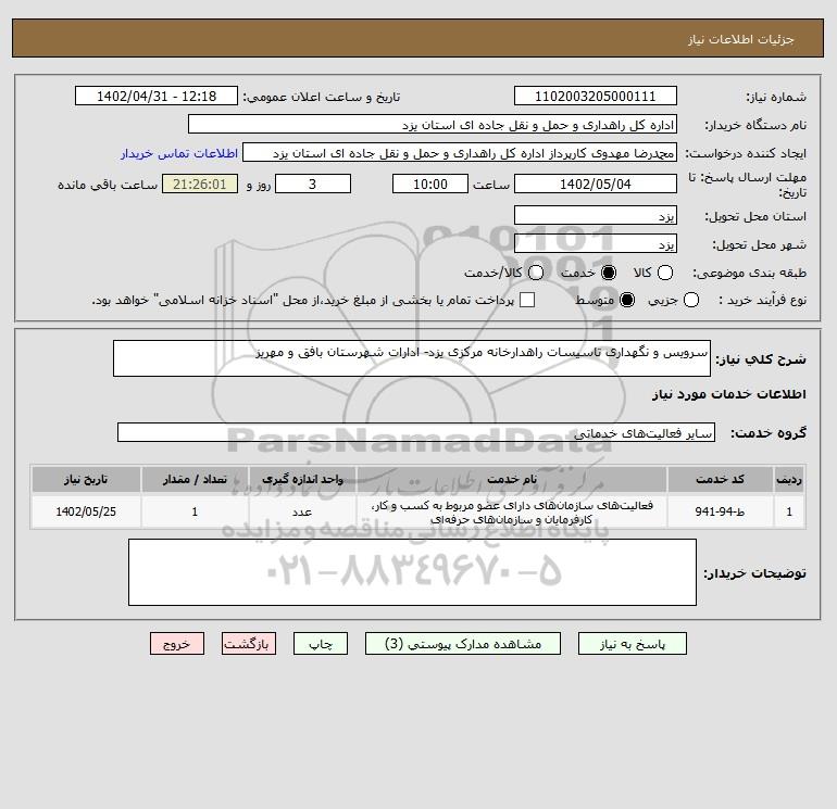شرح کلی نیاز: سرویس و نگهداری تاسیسات راهدارخانه مرکزی یزد- ادارات شهرستان بافق و مهریز