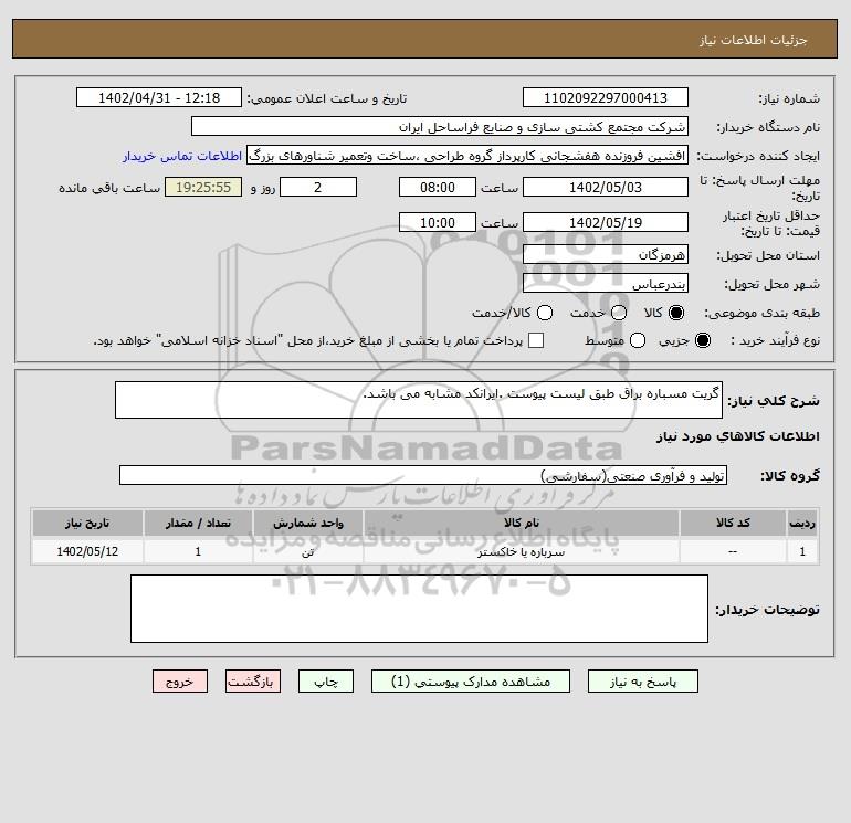 شرح کلی نیاز: گریت مسباره براق طبق لیست پیوست .ایرانکد مشابه می باشد.