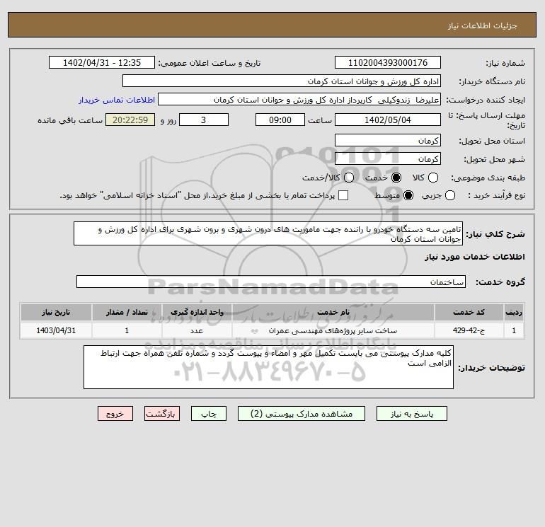 استعلام تامین سه دستگاه خودرو با راننده جهت ماموریت های درون شهری و برون شهری برای اداره کل ورزش و جوانان استان کرمان, استعلام تامین سه دستگاه خودرو با راننده جهت ماموریت های درون شهری و برون شهری برای اداره کل ورزش و جوانان استان کرمان