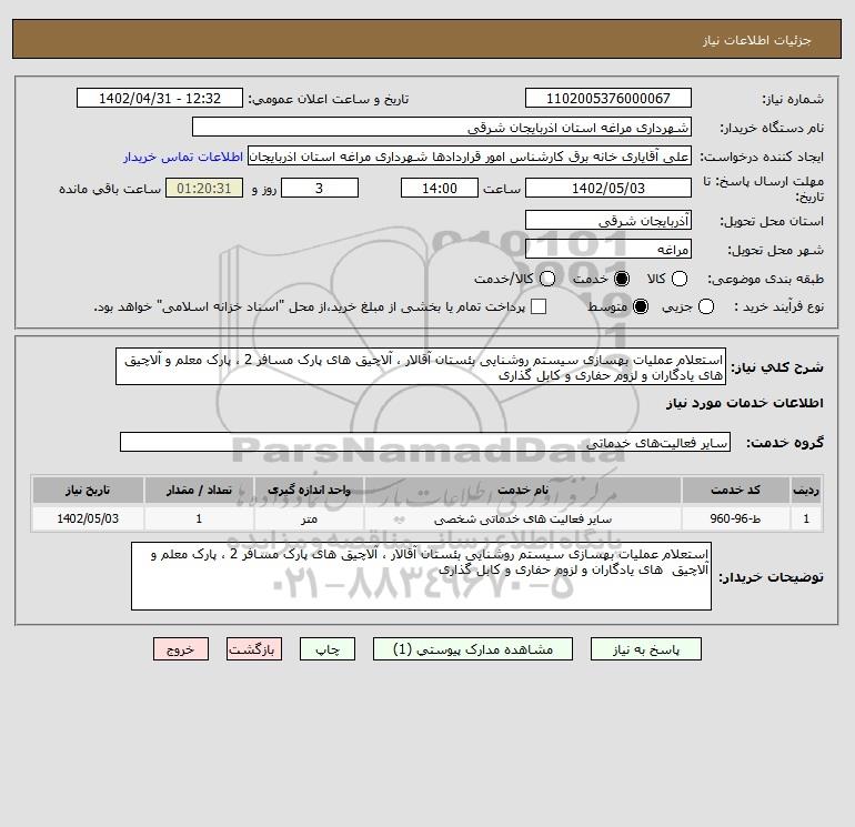 استعلام استعلام عملیات بهسازی سیستم روشنایی بئستان آقالار ، آلاچیق های پارک مسافر 2 ، پارک معلم و آلاچیق های یادگاران و لزوم حفاری و کابل گذاری, استعلام استعلام عملیات بهسازی سیستم روشنایی بئستان آقالار ، آلاچیق های پارک مسافر 2 ، پارک معلم و آلاچیق های یادگاران و لزوم حفاری و کابل گذاری
