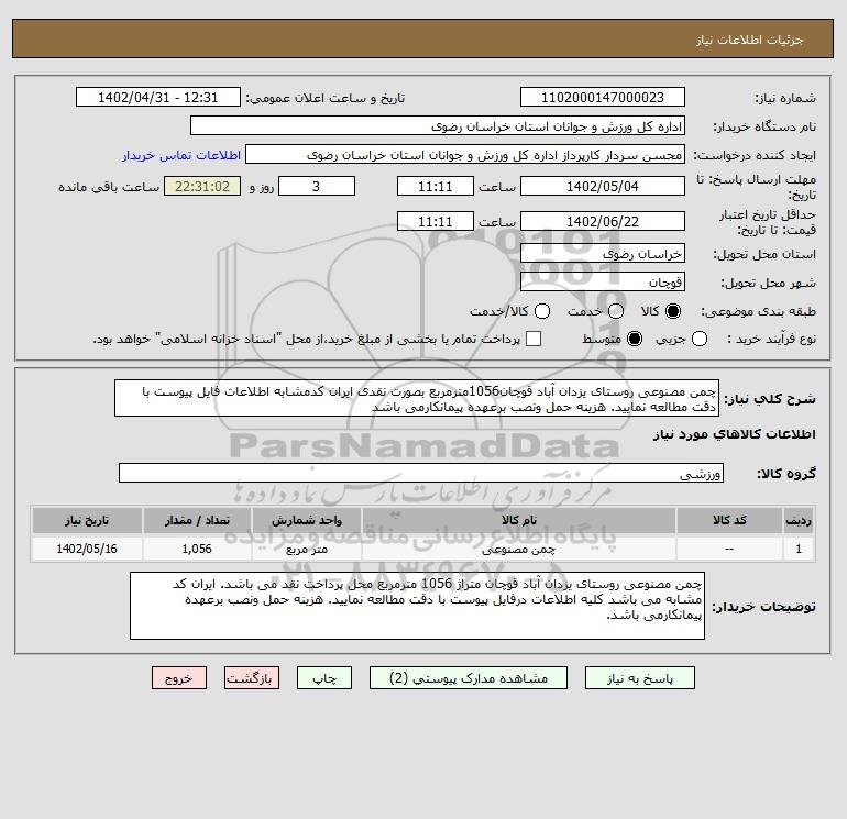 شرح کلی نیاز: چمن مصنوعی روستای یزدان آباد قوچان1056مترمربع بصورت نقدی ایران کدمشابه اطلاعات فایل پیوست با دقت مطالعه نمایید. هزینه حمل ونصب برعهده پیمانکارمی باشد