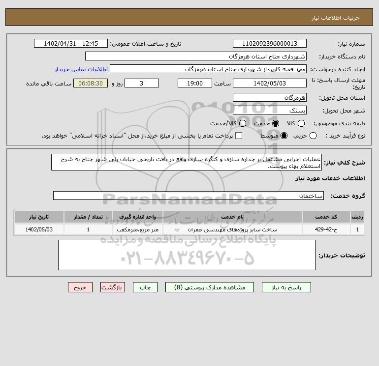 شرح کلی نیاز: عملیات اجرایی مشتمل بر جداره سازی و کنگره سازی واقع در بافت تاریخی خیابان پلی شهر جناح به شرح استعلام بهاء پیوست.