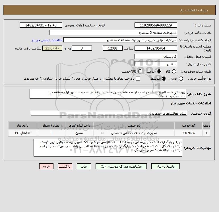 شرح کلی نیاز: پروژه تهیه مصالح و ساخت و نصب نرده حفاظ ایمنی در معابر واقع در محدوده شهرداری منطقه دو سنندج(مرحله اول)