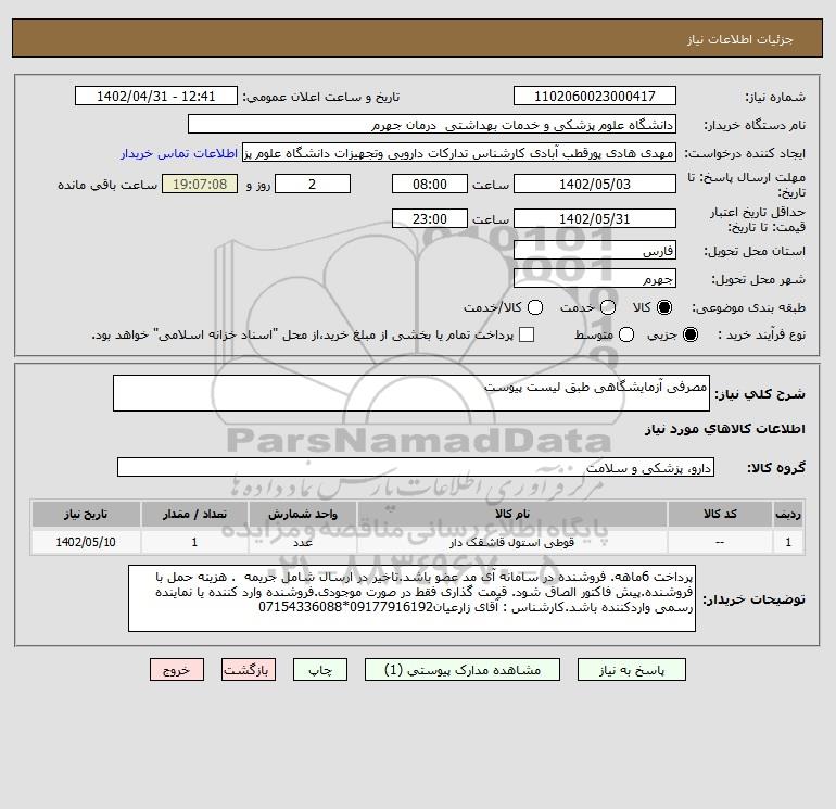 شرح کلی نیاز: مصرفی آزمایشگاهی طبق لیست پیوست