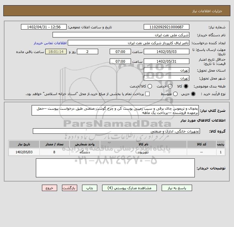 شرح کلی نیاز: یخچال و تریموس چای برقی و سیب زمینی پوست کن و چرخ گوشت صنعتی طبق درخواست پیوست --حمل برعهده فروشنده ---پرداخت یک ماهه