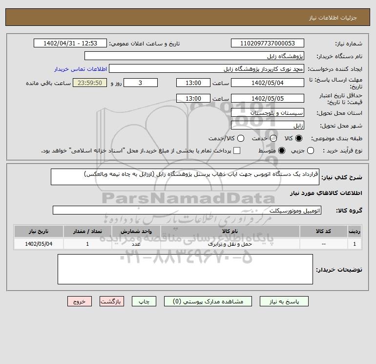 استعلام قرارداد یک دستگاه اتوبوس جهت ایاب ذهاب پرسنل پژوهشگاه زابل (اززابل به چاه نیمه وبالعکس), استعلام قرارداد یک دستگاه اتوبوس جهت ایاب ذهاب پرسنل پژوهشگاه زابل (اززابل به چاه نیمه وبالعکس)