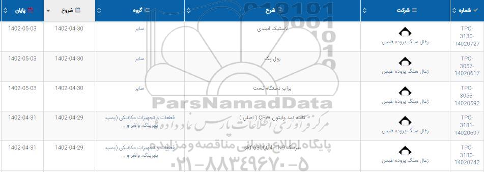 | TPC-3130-14020727 | زغال سنگ پروده طبس | لاستیک آببندی | سایر | 1402.4.30 | 1402.5.3 |