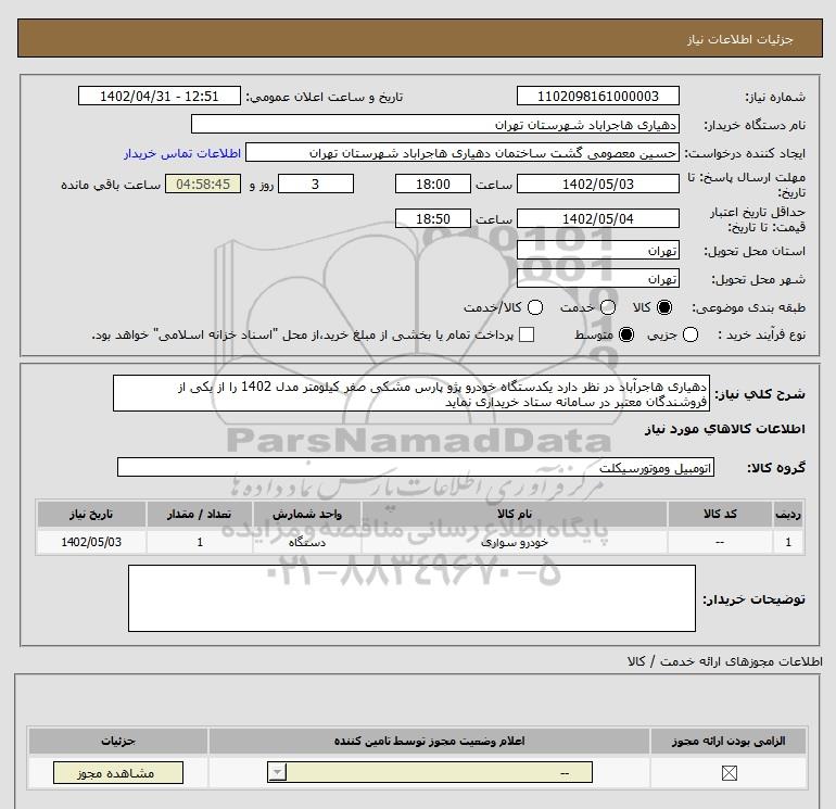 شرح کلی نیاز: دهیاری هاجرآباد در نظر دارد یکدستگاه خودرو پژو پارس مشکی صفر کیلومتر مدل 1402 را از یکی از فروشندگان معتبر در سامانه ستاد خریداری نماید