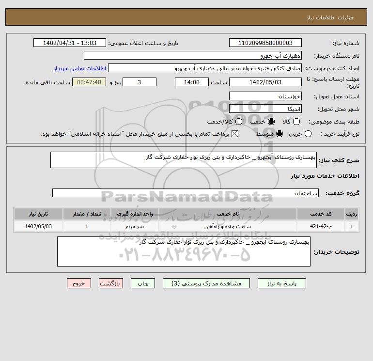 شرح کلی نیاز: بهساری روستای آبچهرو _ خاکبرداری و بتن ریزی نوار حفاری شرکت گاز