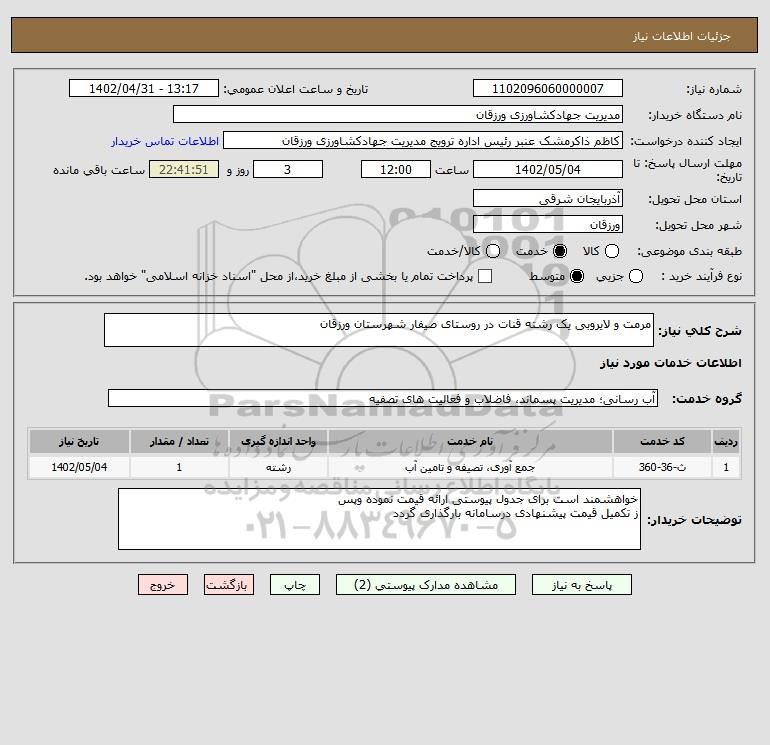 شرح کلی نیاز: مرمت و لایروبی یک رشته قنات در روستای صیفار شهرستان ورزقان