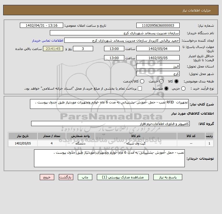 شرح کلی نیاز: تجهیزات RFID نصب - حمل -آموزش -پشتیبانی به مدت 6 ماه -لوازم وتجهیزات موردنیاز طبق جدول پیوست .