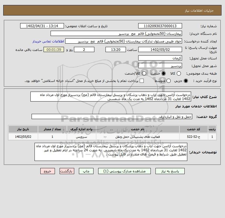 شرح کلی نیاز: درخواست آژانس جهت ایاب و ذهاب پزشکان و پرسنل بیمارستان قائم (عج) بردسیراز مورخ اول مرداد ماه 1402 لغایت 31 مردادماه 1402 به مدت یک ماه شمسی