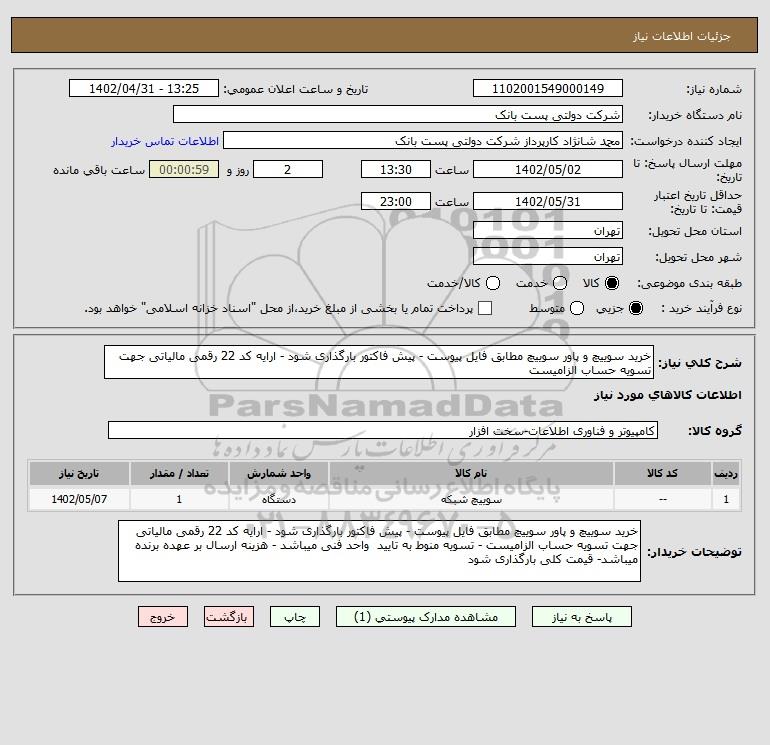شرح کلی نیاز: خرید سوییچ و پاور سوییچ مطابق فایل پیوست - پیش فاکتور بارگذاری شود - ارایه کد 22 رقمی مالیاتی جهت تسویه حساب الزامیست
