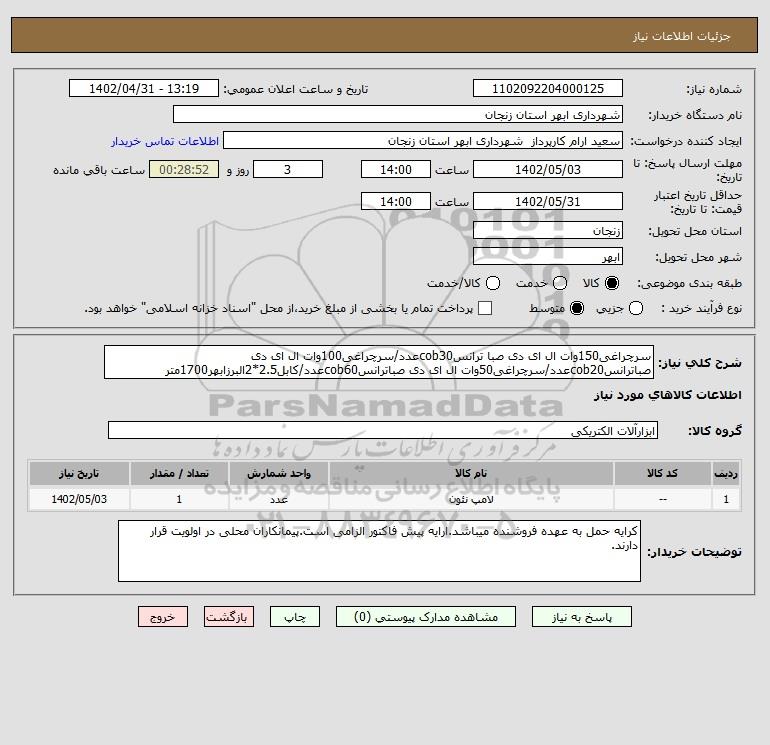 استعلام سرچراغی150وات ال ای دی صبا ترانسcob30عدد/سرچراغی100وات ال ای دی صباترانسcob20عدد/سرچراغی50وات ال ای دی صباترانسcob60عدد/کابل2.5*2البرزابهر1700متر, استعلام سرچراغی150وات ال ای دی صبا ترانسcob30عدد/سرچراغی100وات ال ای دی صباترانسcob20عدد/سرچراغی50وات ال ای دی صباترانسcob60عدد/کابل2.5*2البرزابهر1700متر
