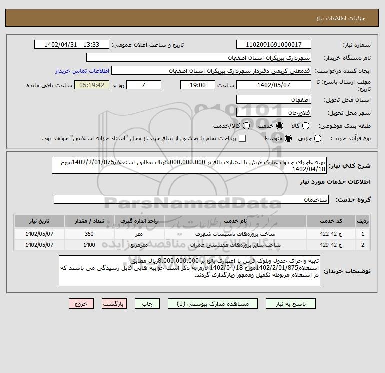 شرح کلی نیاز: تهیه واجرای جدول وبلوک فرش با اعتباری بالغ بر 8.000.000.000ریال مطابق استعلام1402/2/01/875مورخ 1402/04/18