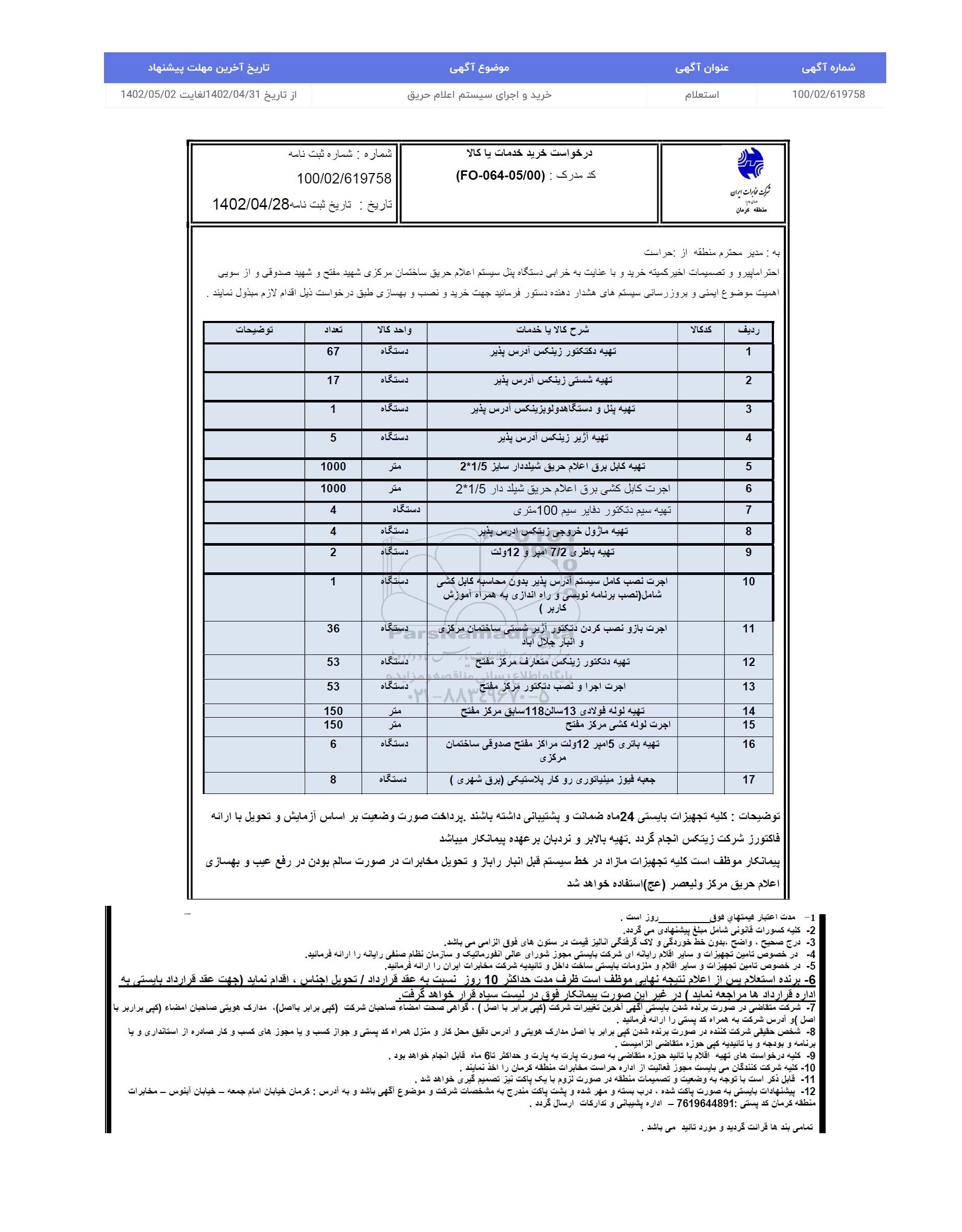 100/02/619758 استعلام خرید و اجرای سیستم اعلام حریق از تاریخ 1402.4.31 لغایت 1402.5.2