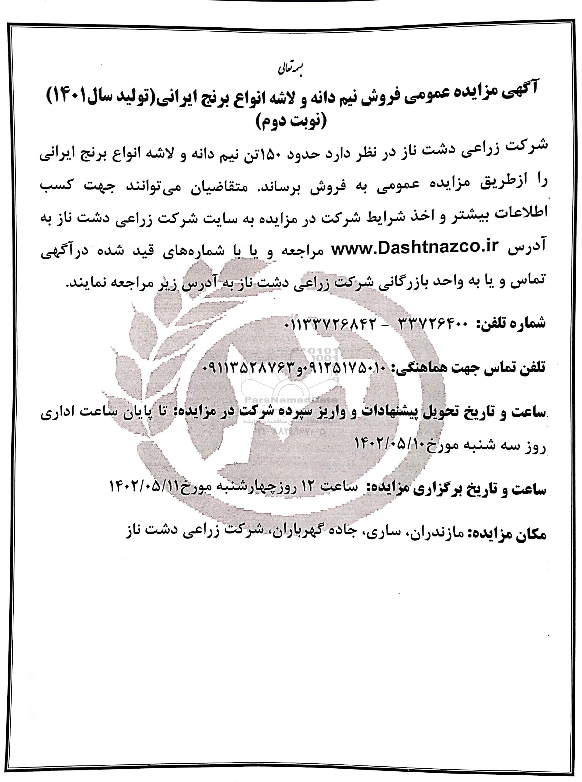 شرکت زراعی دشت ناز در نظر دارد حدود 150 تن نیم دانه و لاشه انواع برنج ایرانی خود را از طریق مزایده عمومی به فروش برساند. متقاضیان می توانند جهت کسب اطلاعات بیشتر و اخذ شرایط شرکت در مزایده به سایت شرکت زراعی دشت ناز به آدرس www.Dashtnazco.ir مراجعه و یا با شماره های قید شده در آگهی تماس و یا به واحد بازرگانی شرکت زراعی دشت ناز به آدرس زیر مراجعه نمایند.