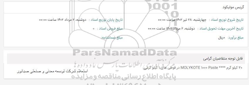 20 کیلوگرم MOLYKOTE1000 PASTE در قوطی های 1 کیلوگرمی