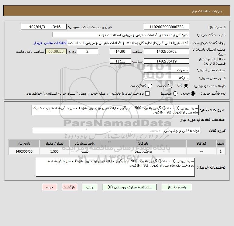 توضیحات خریدار:سویا پروتِین ((سبحان)) گونی به وزن 1500 کیلوگرم .دارای تاریخ تولید روز .هزینه حمل با فروشنده .پرداخت یک ماه پس از تحویل کالا و فاکتور.