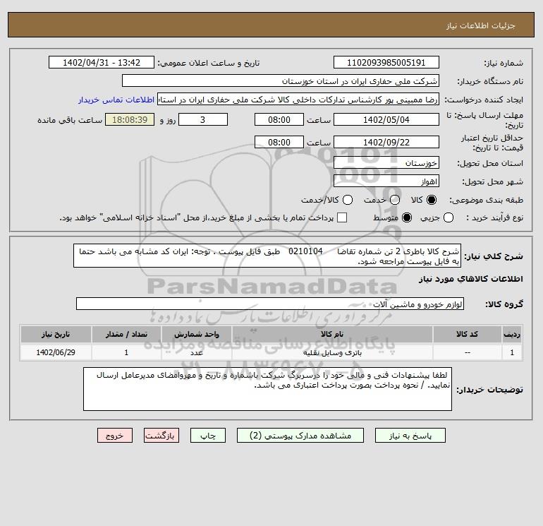 شرح کلی نیاز: شرح کالا باطری 2 تن شماره تقاضا 0210104 طبق فایل پیوست . توجه: ایران کد مشابه می باشد حتما به فایل پیوست مراجعه شود.