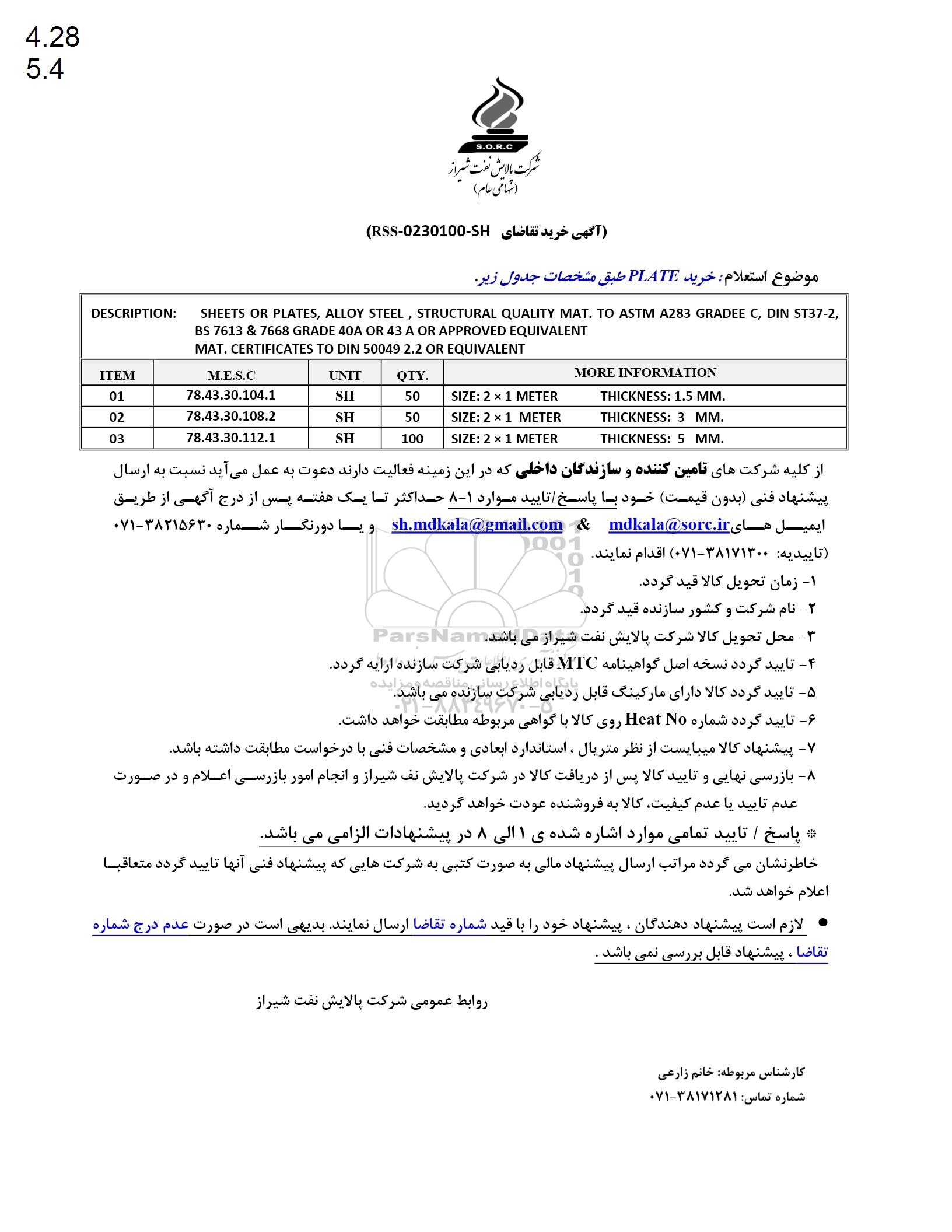 موضوع استعلام: خرید PLATE طبق مشخصات جدول زیر