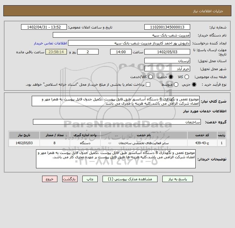 شرح کلی نیاز: موضوع تعمی و نگهداری 8 دستگاه آسانسور طبق فایل پیوست ،تکمیل جدول فایل پیوست به همرا مهر و امضاء شرکت الزامی می باشد،کلیه هزینه با مجری می باشد