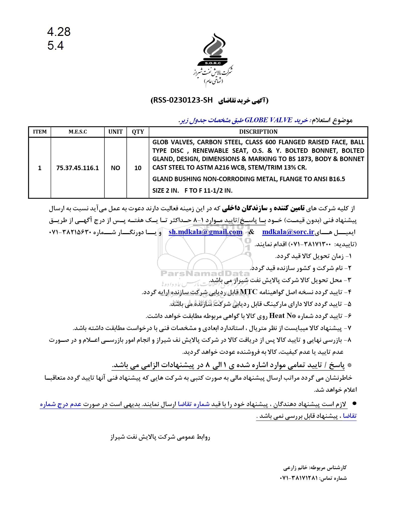 موضوع استعلام خرید GLOBE VALVE طبق مشخصات جدول زیر