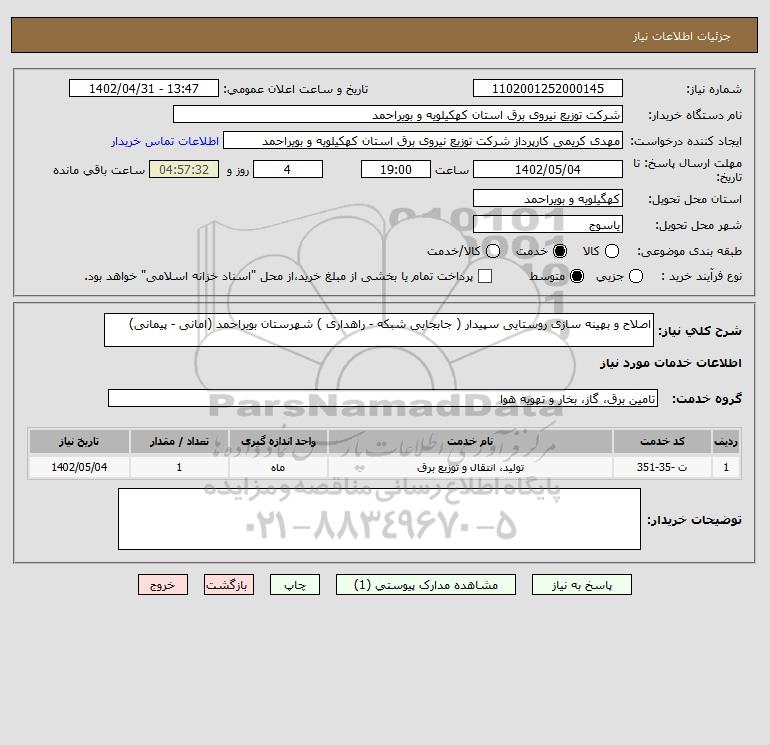 شرح کلی نیاز: اصلاح و بهینه سازی روستایی سپیدار ( جابجایی شبکه - راهداری ) شهرستان بویراحمد (امانی - پیمانی)