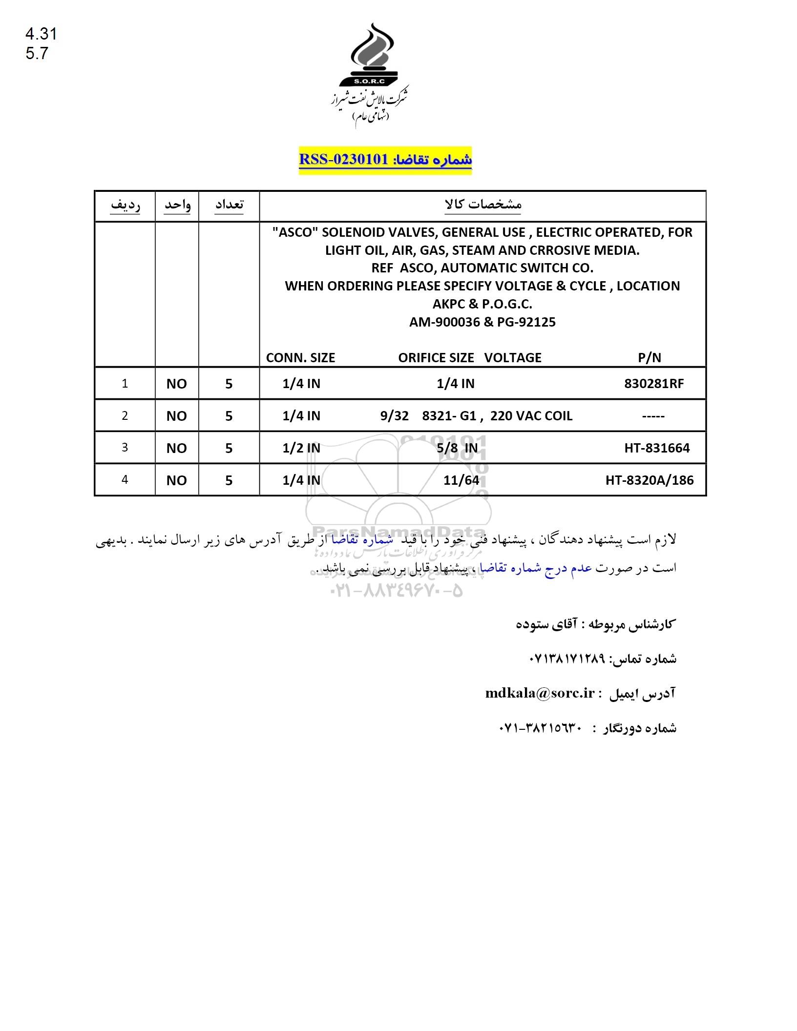 استعلام بها و موضوع استعلام استعلام ASCO SOLENOID VALVES... به اطلاع کلیه شرکتها و افراد متخصص واجد شرایط میرساند، آگهی گذار در نظر دارد از طریق استعلام بها، نسبت به انتخاب و دریافت پیشنهادات اقدام نماید. این استعلام با کد آگهی ثبت شده در سامانه خبرگزاری پارس نماد : 6121616 منتشر شده است. مشخصات استعلام : تاریخ شروع استعلام: 1402/04/31 آخرین مهلت ارسال پیشنهاد قیمت : 1402/05/07 و محل اجرای پروژه : استان سایر میباشد. استعلام قیمت مورد درخواست : استعلام ASCO SOLENOID VALVES... با دستهبندیهای تخصصی و گروه های مرتبط : شیرآلات, تجهیزات نفت و گاز, استعلام اطلاع رسانی میگردد.