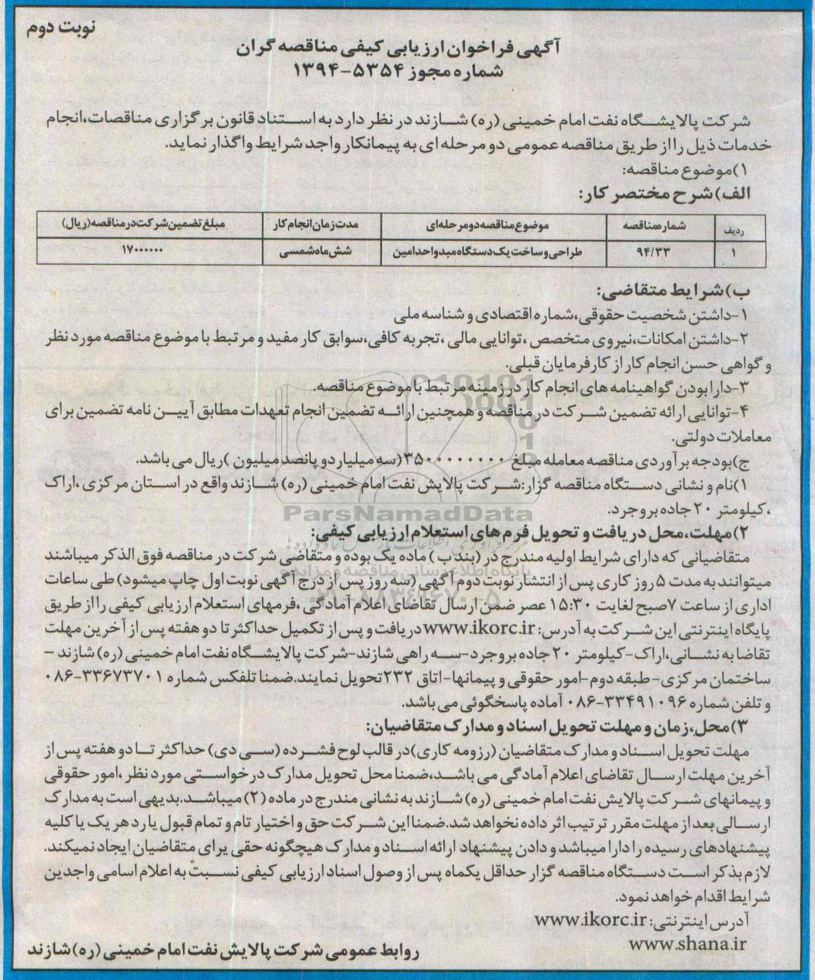 مناقصه طراحی و ساخت یک دستگاه مبدل واحد آمین نوبت دوم از کلیه افراد متخصص و شرکتها واجد شرایط دعوت به عمل میآید در مناقصه با کد خبرگزاری پارس نماد: 612162 شرکت نمایند.