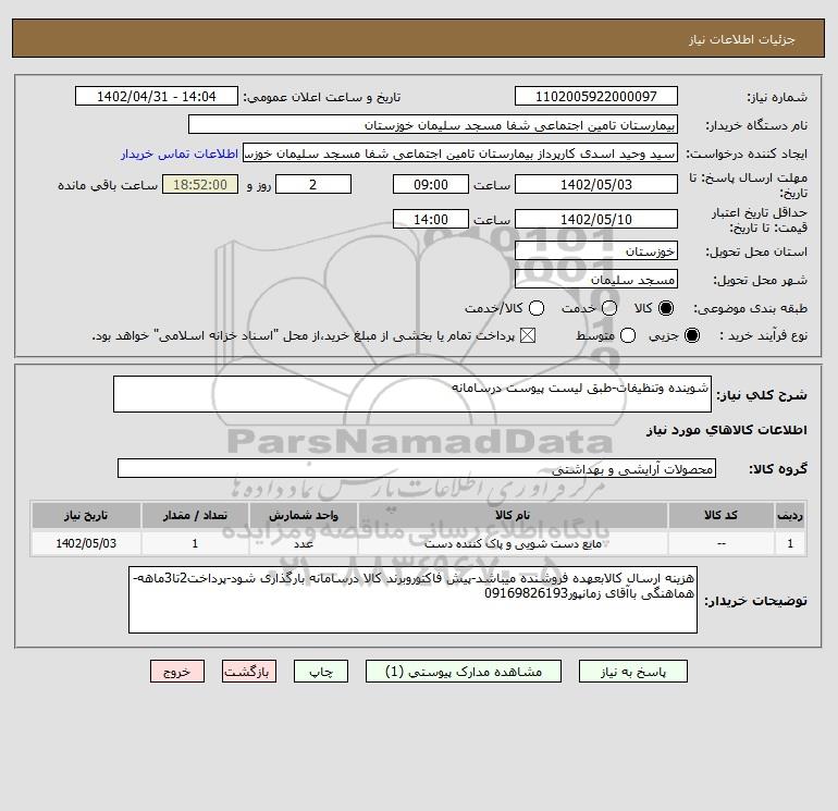 شرح کلی نیاز: شوینده وتنظیفات-طبق لیست پیوست درسامانه