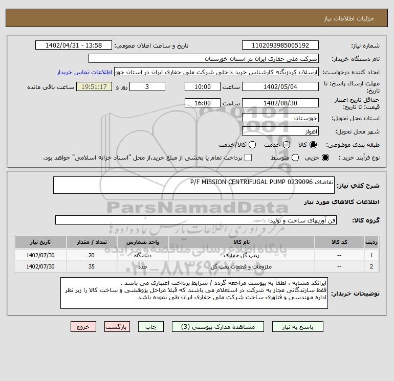 شرح کلی نیاز: تقاضای 0239096 P/F MISSION CENTRIFUGAL PUMP