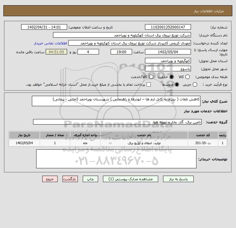 شرح کلی نیاز: کاهش تلفات ( سیم به کابل ارم ها – ابوذرها و راهنمایی ) شهرستان بویراحمد (امانی - پیمانی)