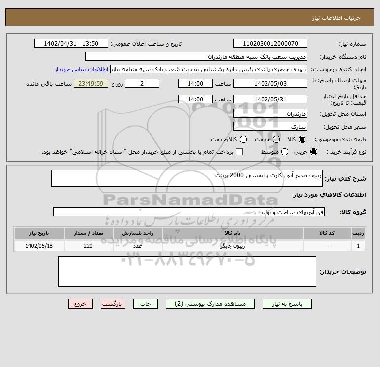 شرح کلی نیاز: ریبون صدور آنی کارت پرایمسی 2000 پرینت