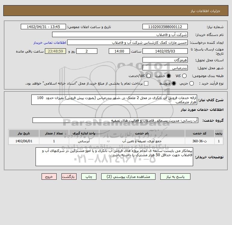 شرح کلی نیاز: ارائه خدمات فروش آب تانکری در محل 2 علمک در شهر بندرعباس (بصورت پیش فروش) بمیزان حدود 100 هزار مترمکعب