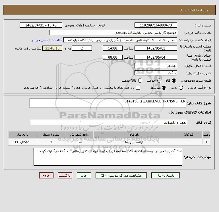 شرح کلی نیاز: LEVEL TRANSMITTER/تقاضای 0140153