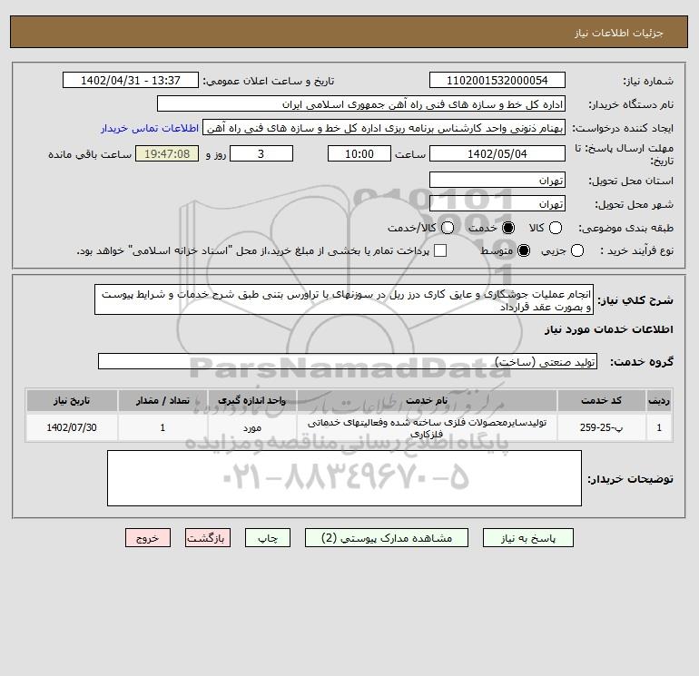 استعلام بها و موضوع استعلام استعلام انجام عملیات جوشکاری و عایق کاری درز ریل در سوزنهای با تراورس بتنی طبق شرح خدمات و شرایط پیوست و بصورت عقد قرارداد به اطلاع کلیه شرکتها و افراد متخصص واجد شرایط میرساند، آگهی گذار در نظر دارد از طریق استعلام بها، نسبت به انتخاب و دریافت پیشنهادات اقدام نماید. این استعلام با کد آگهی ثبت شده در سامانه خبرگزاری پارس نماد : 6121707 منتشر شده است. مشخصات استعلام : تاریخ شروع استعلام: 1402/04/31 آخرین مهلت ارسال پیشنهاد قیمت : 1402/05/04 و محل اجرای پروژه : استان تهران میباشد. استعلام قیمت مورد درخواست : استعلام انجام عملیات جوشکاری و عایق کاری درز ریل در سوزنهای با تراورس بتنی طبق شرح خدمات و شرایط پیوست و بصورت عقد قرارداد با دستهبندیهای تخصصی و گروه های مرتبط : خدمات صنعتی, انواع عایق های رطوبتی ،حرارتی ،صوتی, راه آهن, جوشکاری, بوژی واگن, راهسازی, استعلام اطلاع رسانی میگردد.