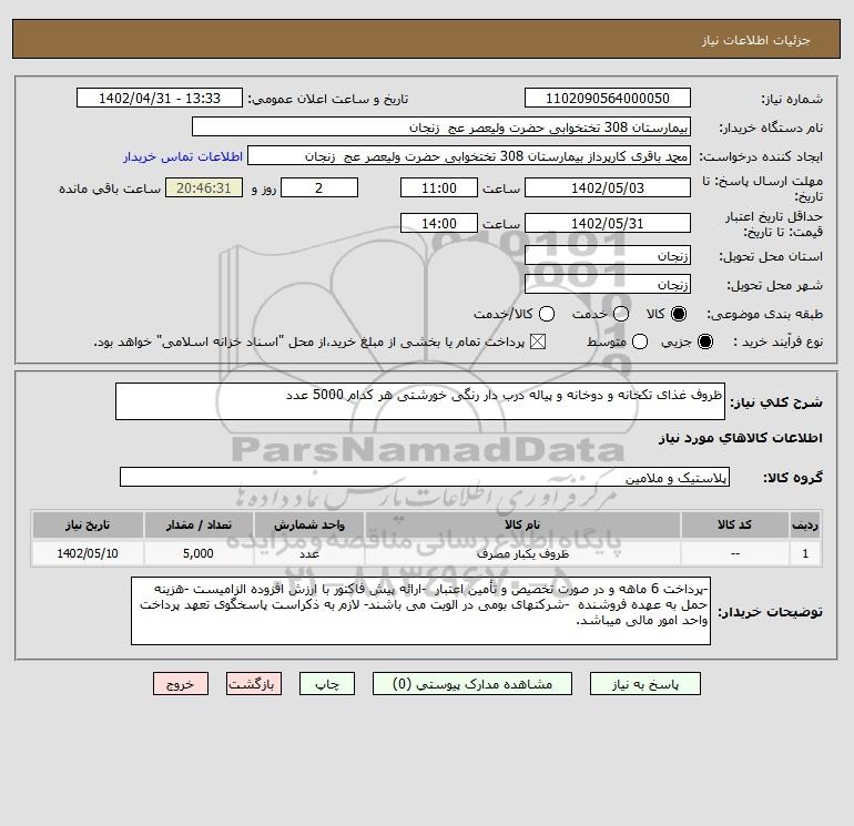 | 1 | -- | ظروف یکبار مصرف | عدد | 5,000 | 1402/05/10 |