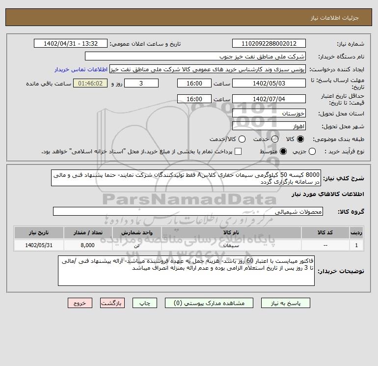شرح کلی نیاز: 8000 کیسه 50 کیلوگرمی سیمان حفاری کلاسA فقط تولیدکنندگان شرکت نمایند- حتما پشنهاد فنی و مالی در سامانه بارگزاری گردد