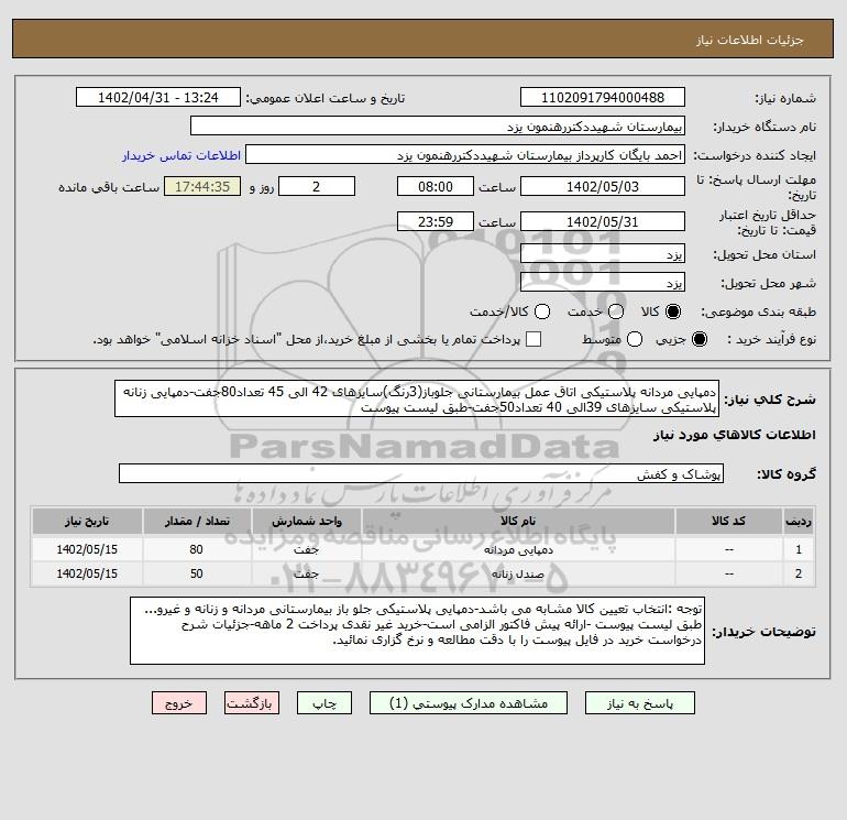 شرح کلی نیاز: دمپایی مردانه پلاستیکی اتاق عمل بیمارستانی جلوباز(3رنگ)سایزهای 42 الی 45 تعداد80جفت-دمپایی زنانه پلاستیکی سایزهای 39الی 40 تعداد50جفت-طبق لیست پیوست